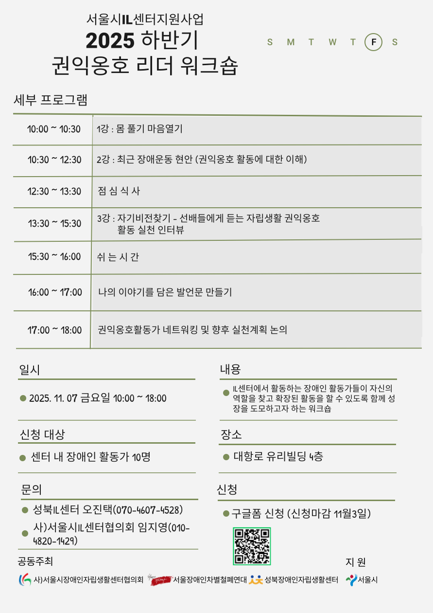 2025년 하반기 권익옹호리더워크숍 안내 및 모집 성북장애인자립생활센터에서는 자신의 역할을 찾고 확장된 활동을 할 수 있도록 함께 성장을 도모하는 워크숍을 진행하고자 합니다. ㅡㅡㅡㅡㅡㅡㅡㅡㅡㅡㅡㅡㅡ 1. 일 시 : 11월 07일(금) 10:00 ~ 18:00 2. 장 소 : 대항로 유리빌딩 4층(종로구 동숭길 25, 4층) 3. 신청기간 : 11월 03일(월) 까지 4. 신청대상 : 센터 내 장애인활동가 10명 5. 접수방법 : 구글폼(https://forms.gle/oXKrTjZimZt1PG4Y8) 작성 후 제출 6. 문 의 : 기획사업팀 오진택(070-4607-4528) 사)서울시장애인자립생활센터협의회 임지영(010-4820-1429) |