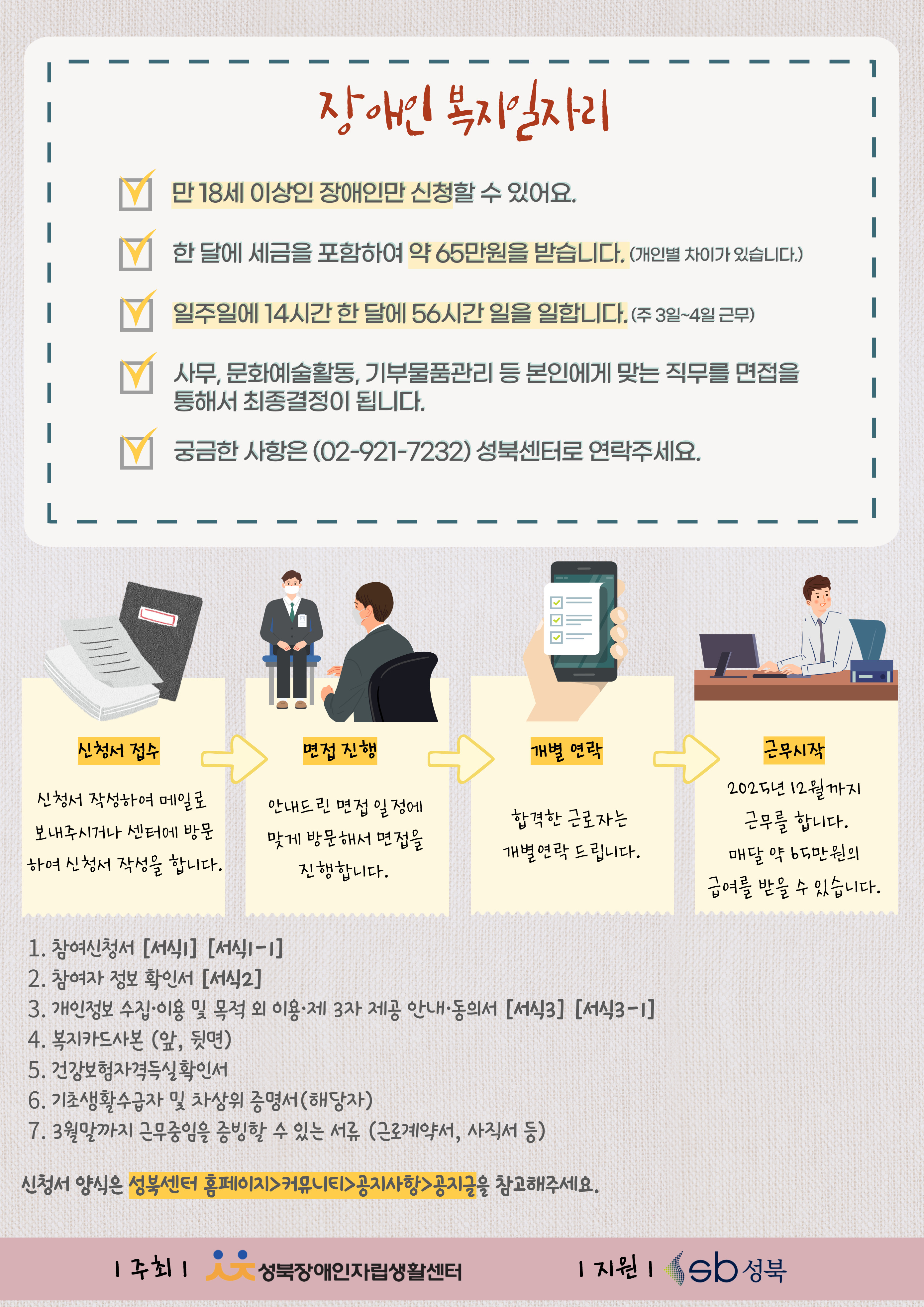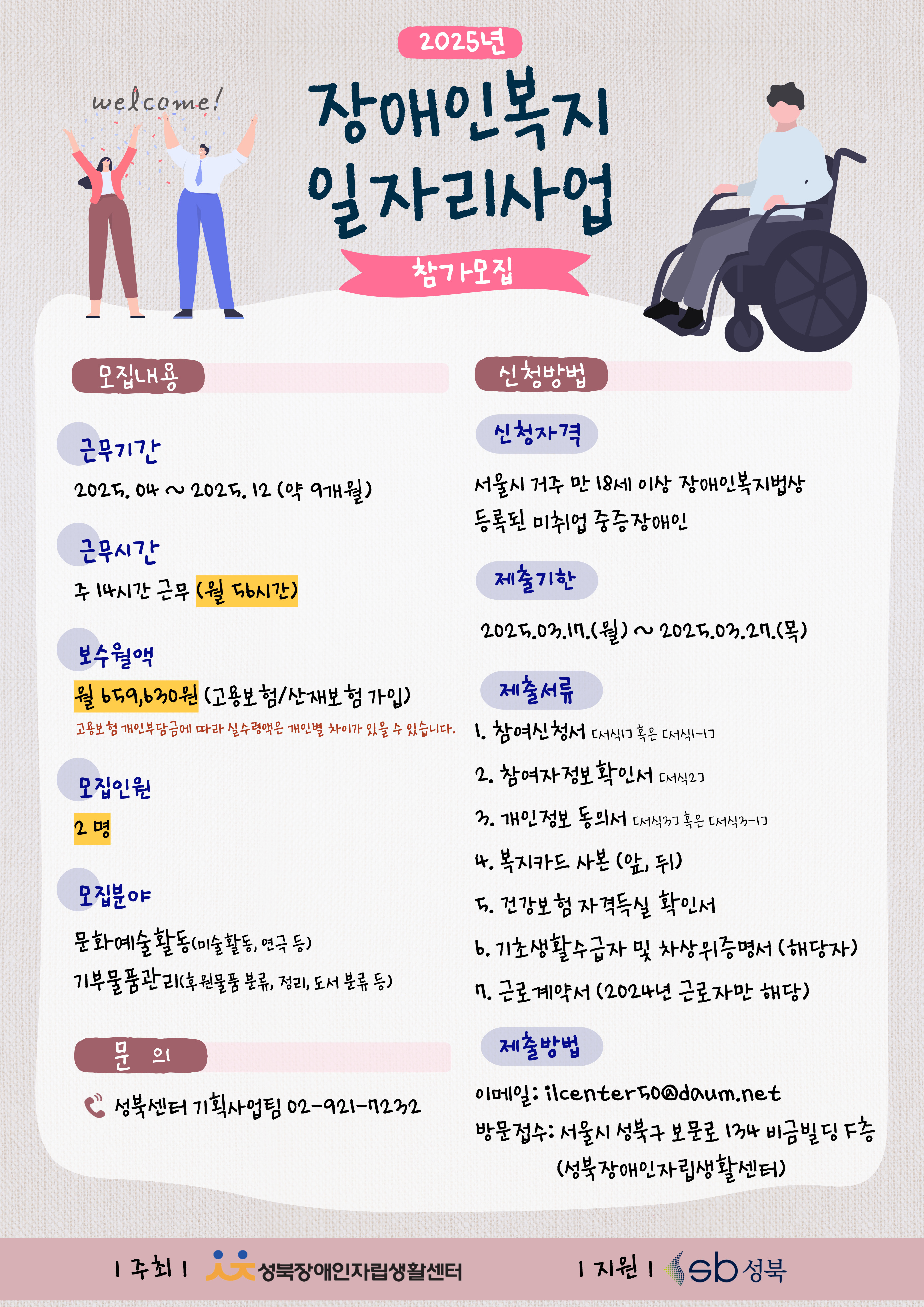 ⑥ 기초생활수급자 및 차상위증명서 (해당자에 한함) ⑦ 근로계약서 (해당자에 한함) * 당해년도 근무하고 있는 참여자는 2024년 12월 31일까지 근무한다는 증빙서류 필요 5. 접수방법: 이메일, 방문접수 6. 접수처: 성북장애인자립생활센터